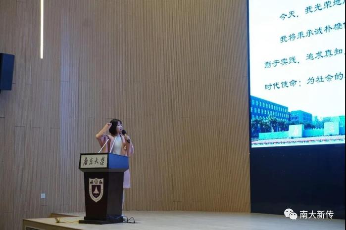 在刘一醇的带领下,全体研究生新生举起右拳,进行了庄严的入学宣誓。最后,师生们在《南京大学校歌》中结束了此次的开学典礼。