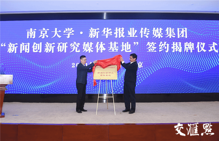 陆延青副校长和双传学社长共同为“新闻创新研究媒体基地”揭牌。