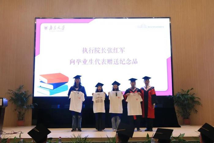 向毕业生代表向毕业生赠送毕业纪念衫。
