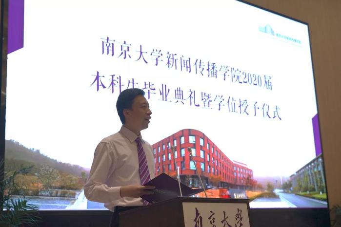 典礼上的第一个环节为本科毕业生代表发言。2020届新闻学专业的贾威同学分享了四年的学习感悟。他从专业与温情这两个角度分享了在南大新传这四年的所学所得。精妙深邃的新闻理论课程、贴近实践的采写课程与丰富多样的媒体实习让他成长为一名专业的新闻学子,专业也是新闻之所以为新闻的根本。另一方面,他提到,新闻是一门人学,需要人之为人的温情,南大新传的老师将这种温情言传身教给莘莘学子。所谓的“新”火相传指的就是这样的一份绵延不绝的温情与责任,如同燃起熊熊火焰的火把,不停地在南大师生之间传递着,所到之处,便点亮一方黑暗。