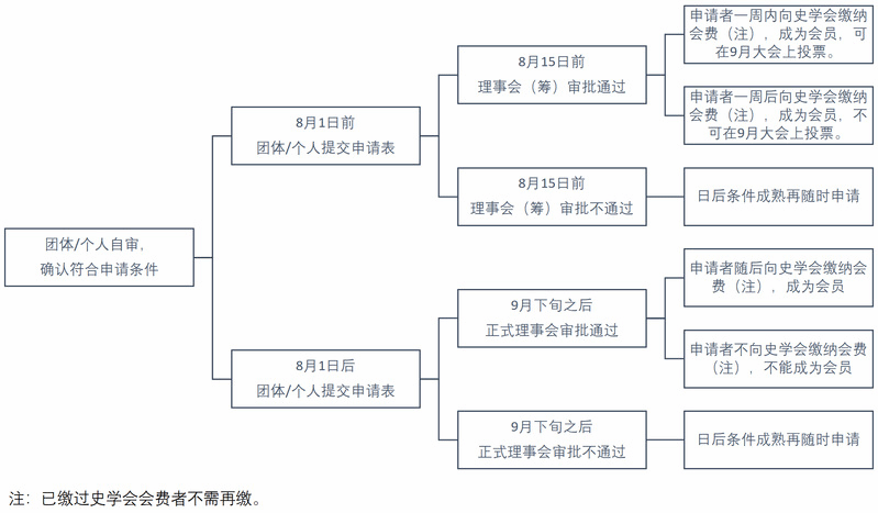 3、在2018年8月1日前提交的申请,审定结果将于8月15日前公布。通过审定者请在一周内(即8月22日前)向史学会缴纳会费(详情见下)。向史学会成功缴纳会费是获得会员资格的必要条件。合格会员可在9月22日举办的首届会员大会上行使会员责权(如审批分会章程、选举理事会等)。