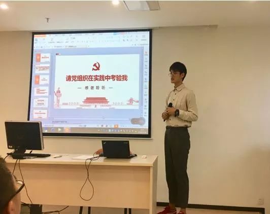 2018级专硕党支部的耿慧聪、黄薇等同志围绕自身学习方面进行自我鉴定,通过严格要求自己,专业学习上在预备期里有很大提升。“在专业实习的过程中,我受到了党史教育更加深刻。我会牢记我入党的日期,和生日一样重要。”黄薇同志结合专业实践的亮点进行汇报.