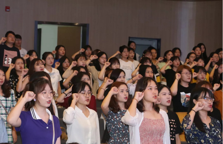 在高毅丹同学的带领下,全体新生举起右拳,进行了庄严的入学宣誓。最后,全场高唱南京大学校歌。