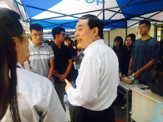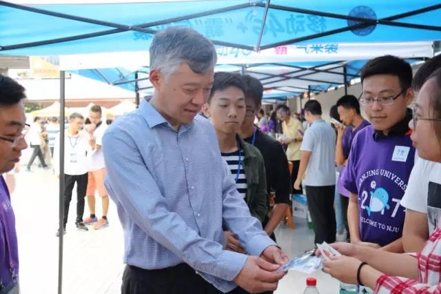 党委副书记芮富宏老师,人文科学试验班辅导员王霏皓老师、范峻恺老师一直在迎新展台陪伴着志愿者,迎接着新生们和家长们。帅帅的张异宾书记和萌萌的陈骏校长也先后到访人文大类的展台,向新生及其家长们表示欢迎和感谢,询问志愿者们和老师们此次迎新工作的感受和收获。志愿者们在吸取了没有约到张异宾书记合影的教训后,成功地与陈骏校长进行了合影留念。五个院系的同学们纷纷露出开(得)心(逞)的笑容。