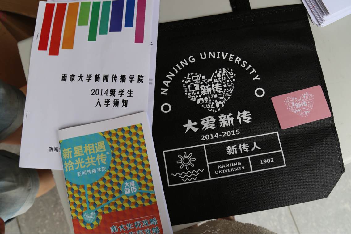 29日上午9点,不顾天空中下着的蒙蒙细雨,新传学生会成员赶到迎新平台处布置展台,摆放迎新宣传品。在迎新的新生手袋中,新传学生会成员为新生们精心准备了新传新生手册、印有新传logo的卡贴,水壶贴等,并且布置了迎新海报和签名墙。