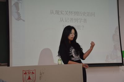 海燕老师介绍了她带领南京大学学生记者团进行的调查报道活动,例如行走淮河报道,安徽百户农民秋收报告。报道深刻而真实的记录了中国农民的生活百态,高度的人文关怀,悲悯但客观的新闻态度,打动了在场的每一颗热切的赤子之心。随后她又介绍了苏北化工区调查,四川震后百日调查,三江源环保与移民生态调查等,从一帧帧新闻现场的画面和海燕老师专业冷静的解说中,同学们逐步认识到新闻应最大程度地逼近真实,以及批判性思维和质疑精神在新闻人的职业生涯中是多么重要。她告诉新生,心灵的成长意味着懂得成为怎样的人、懂得以什么样的态度去观察世界、懂得以何种方式判断并行动。