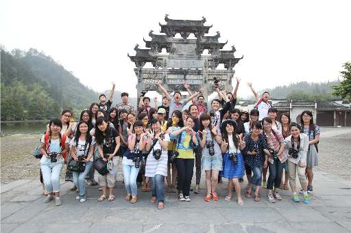 在2014高考大片即将全国同步上映之际,我们——南大新传12级新闻系全班去皖南宏村上课,迎(zhu)接(fu)即将到(shang)来(jia)的14级学弟学妹。(老师说了,要用这张照片骗学弟学妹呢 恭祝学弟学妹高考大吉,多来几只新鲜的学弟学妹) 6月6号早晨8点多,在新闻摄影课任课教师刘源老师,以及12级辅导员周围老师的带领下,一行人浩浩荡荡地开向宏村,进行为期两天半的新闻摄影课程实践活动。 吃过午饭,稍事休息后,大家就带着单反奔向了宏村最美的经典——南湖、月沼。小伙伴们不断地拍照,还没忘自拍、偷拍。 第二天,大家去了南屏、关麓、西递。 (途中不断以设备打败游客的手机) 晚上,期待已久的篝火晚会让所有人high了起来。作为寿星的钟川童鞋完全忘记了节操二字,竟然比熊熊燃烧的篝火还要火热。(再次祝钟川童鞋生日快乐,早日抱得美人归)