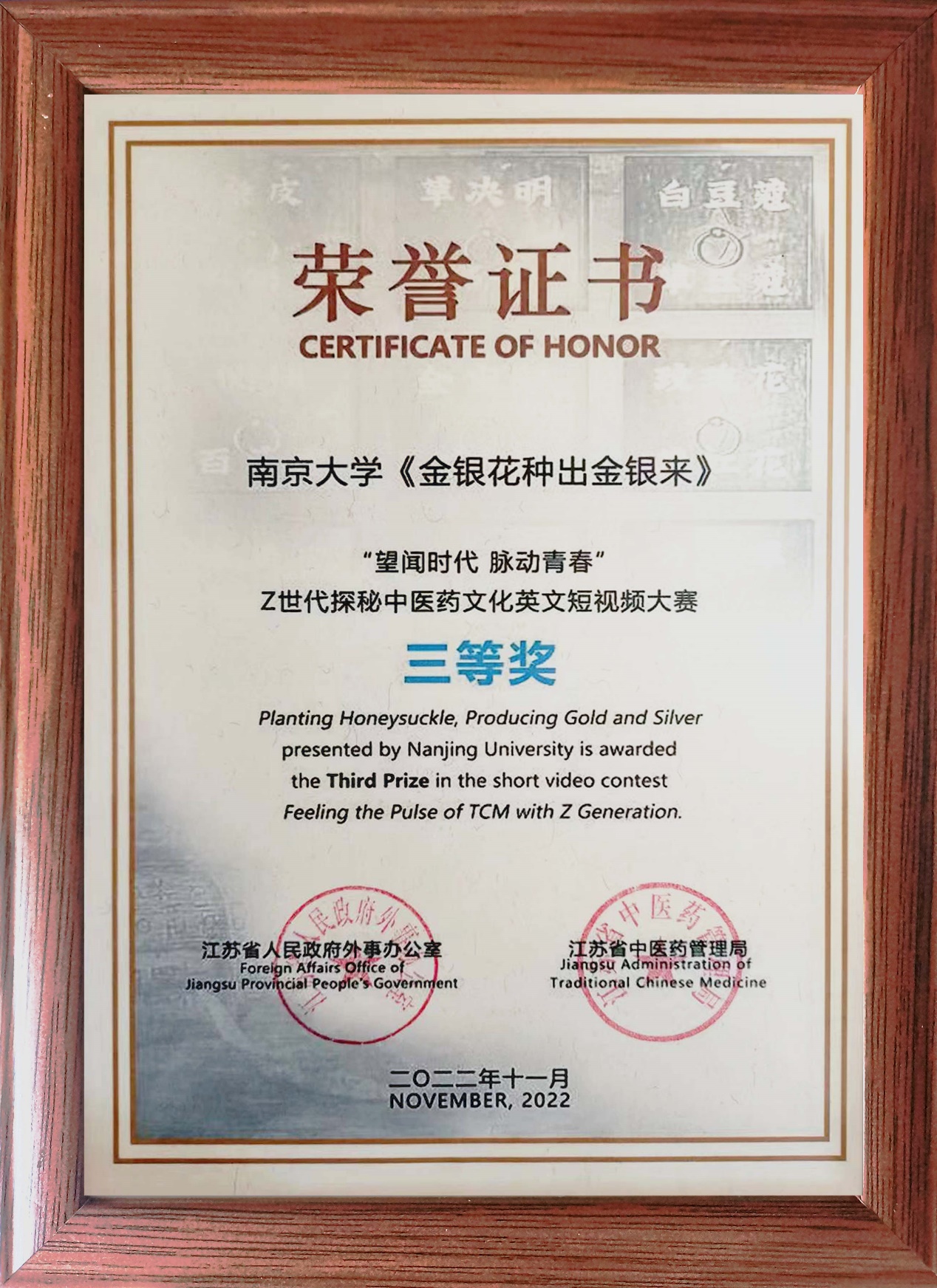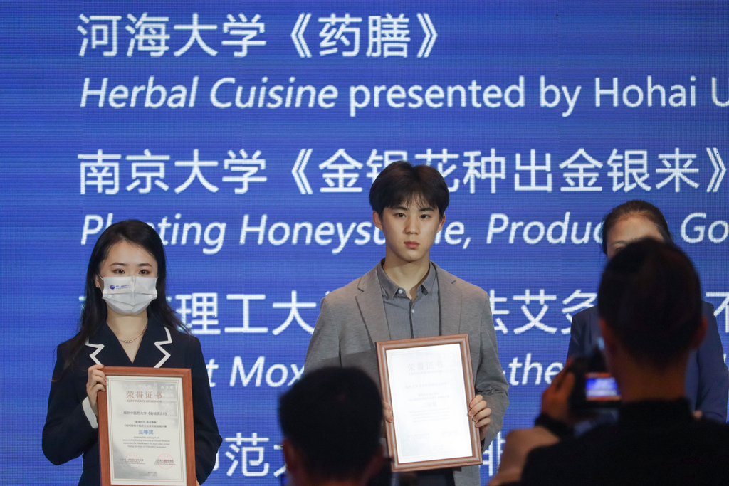 《叶琳娜的东方奇遇》获二等奖;河海大学《药膳》、南京大学《金银花种出金银来》、南京理工大学《古法艾灸:你不知道的中医疗虚秘方》、南京师范大学《咖啡遇上茶》、南京中医药大学《金线莲2.0》获三等奖。获奖作品在江苏中医药国际交流大会上进行了颁奖,并在新华社海外平台上线首发,充分展示了在现代语境下青年群体对中医药的理解与认知,助推中医药文化国际交流推广。