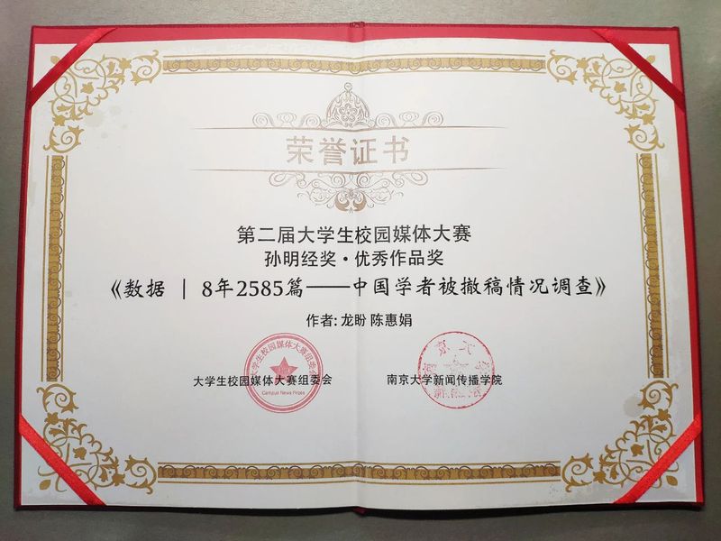 18级本科生龙盼、陈惠娟同学报道《数据 | 8年2585篇——中国学者被撤稿情况调查》荣获数据新闻类奖项,南京大学外国语澳洲幸运10开奖