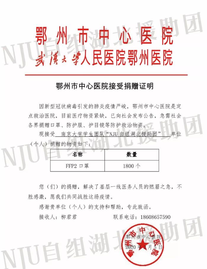 公众号“NJU自组湖北援助团”发布于2月22日的物资公告显示,自2020年1月24日至2月12日,不到三个星期的时间,募捐活动共收到善款人民币2108641.66元,购买护目镜13000余副、医用手套87000双、各类口罩29000只,此外还有若干血氧仪、防护靴、消毒液等短缺医用物资。