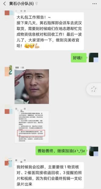 1月30号左右,她刚完成对大象志愿队的采访,大象志愿队的队长象哥在电话中略带哭腔地和她倾诉,说自己确实联系不到有物资的商家了。张瑾想到了NJU自组湖北援助团,当夜就和其负责同学联系。没过多久,一个包含大象志愿队成员及援助团同学的微信群就建起来了。
