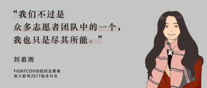 从1月30日开始,新传院2017级本科生刘若雨在FightCOVID组织做志愿者工作。FightCOVID原名Fightncov,是由1000多名境内、海外大学生志愿者组成的民间志愿者团队,旨在用视频、文章等方式向世界人民科普有关于新型冠状病毒的事实、传达中国人民的心声。因为FightCOVID主要是以制作视频的方式传播内容,所以刘若雨运用自己作为新传人的专业技能,负责组织的Logo设计、视频素材收集以及剪辑工作。