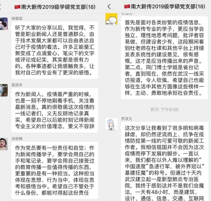 这次疫情让大家充分看到了南大新传学子的责任感和使命感,深刻认识到了我国社会主义制度的优势性,体会到了中国速度、中国规模和中国效率。学生党员勇于担当、积极行动,体现出社会主义建设者和接班人的应有担当。相信在全国人民共同战“疫”的努力下,大家定能共盼春来,夺取胜利。