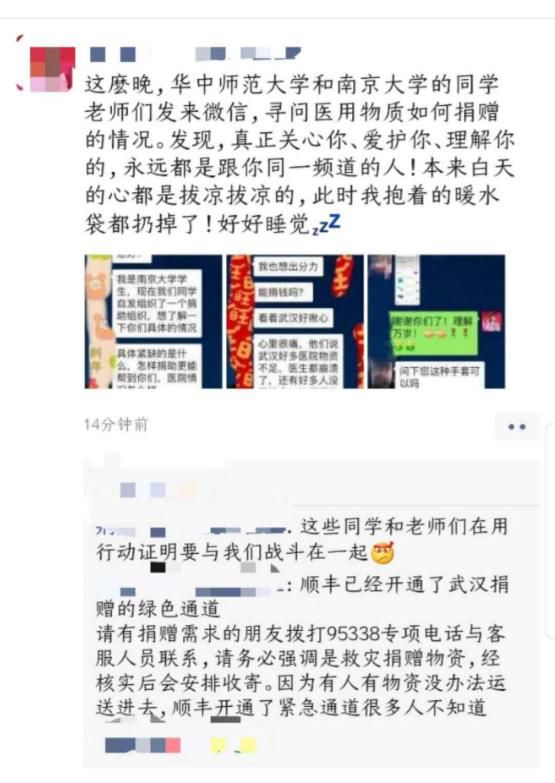大约一天两夜的时间,象哥就说物资到了。她对此印象深刻,是因为象哥收到物资时非常激动。她当时正在赶别的稿子,电脑屏幕上就哗啦哗啦跳出来图片信息。图片很多,内容也十分连贯,让人有一种看视频的感受——NJU自组湖北援助团送来1800只口罩。