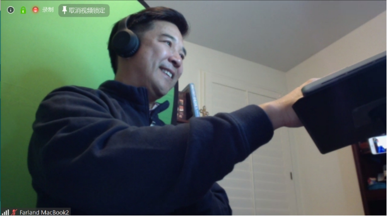 2月14日和15日,Farland老师先后进行了3次直播教学演练,每次演练长达1个半小时,逐渐找到了最清晰的麦克风模式、最佳的直播角度,并克服了通过共享屏幕播放视频却没有声音的难题。